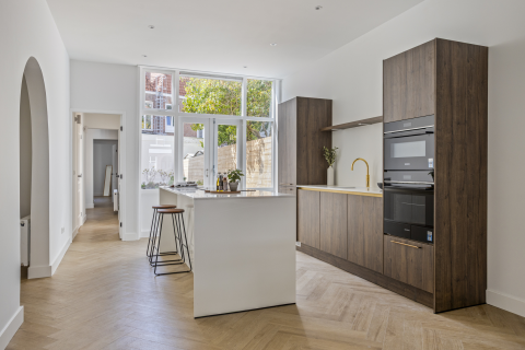 Entree via vestibule en hal met vaste kasten, waaronder de meterkast en aansluiting voor wasmachine, plus kast met C.V. ketel. De lichte, ruime woonkamer met open keuken biedt via openslaande deuren direct toegang tot de zonnige achtertuin. Moderne badkamer met inloopdouche, handdoekradiator en stijlvol wastafelmeubel. Vanuit de hal is eveneens de tuin bereikbaar, evenals de ruime slaapkamer aan de achterzijde.